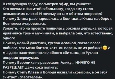 Светлана Прель, штатный психолог реалити-шоу, провела время с участниками, в том числе с новичком Русланом Аслановым. Она поделилась информацией о конфликте: Клава и недавний участник Володя обвинили Степана Карпова в доносительстве, назвав его «крысой». Причиной стало то, что Степан предал огласке поцелуй Клавы с новичком. По мнению Прель, поступок Карпова был оправдан, учитывая, что Клава якобы ждет возвращения Никиты, а Володя изначально пришел на проект к Элине. Кроме того, психолог высказалась по актуальной теме присутствия детей на проекте, отвечая на запрос подписчицы. В настоящий момент на поляне находится только Леончик, но Клава, по всей видимости, планирует позже привезти и своего сына Роберта. Что вы думаете о присутствии маленьких детей на проекте "Дом-2"?