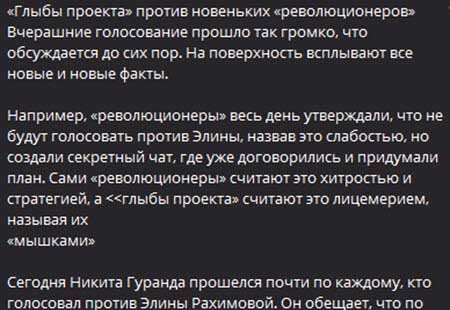 По итогам недавнего голосования проект покинула Элина Рахимова, что незамедлительно вызвало обещание мести со стороны её бывшего партнёра Никиты Гуранды.