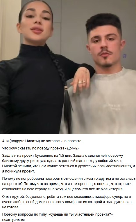 Аня уверяет, что приняла решение не переходить черту и остаться друзьями. Девушка не стала уточнять, что же не устроило ее в Никите в конечном итоге. Однако многие предположили, что парень в очередной раз повел себя, как полный дурак. Причём ничему жизнь Гуранду не учит, ведь так уже было в общении с Дарьей Ямалтдиновой.