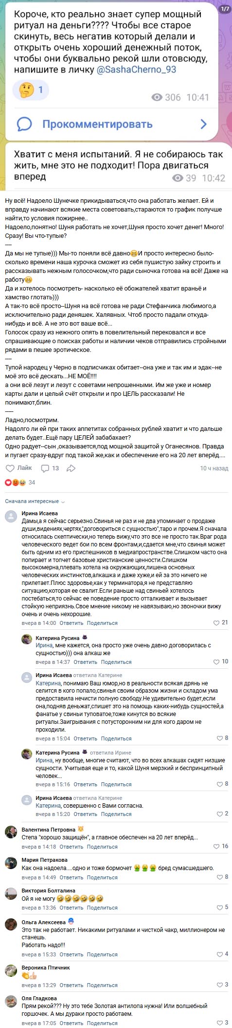 Черно готова прибегнуть к необычным методам для улучшения своего финансового положения. Она активно ищет женщину с экстрасенсорными способностями или опытную колдунью, которая поможет ей избавиться от негативного влияния и привлечь деньги. По словам Александры, она ожидает поступления финансовых средств из самых разных источников.