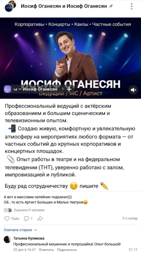 Иосиф Оганесян твердо намерен воспользоваться чередой новогодних праздников. В сети появилось объявление, где Оганесян предлагает свои услуги ведущего мероприятий и корпоративов. При этом Иосиф не забыл перечислить все свои достоинства, якобы выгодно отличающие его от конкурентов.