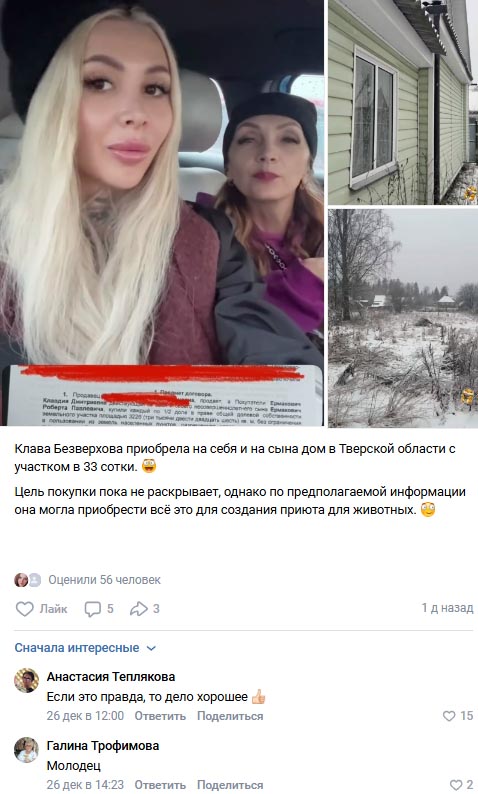 Клавдия Безверхова, выпускница телепроекта «Дом-2», стала счастливой обладательницей собственного жилья. Дом с внушительным участком теперь официально принадлежит ей и её сыну. Пока остаётся неясным, планирует ли она сделать это место своим постоянным жильём.