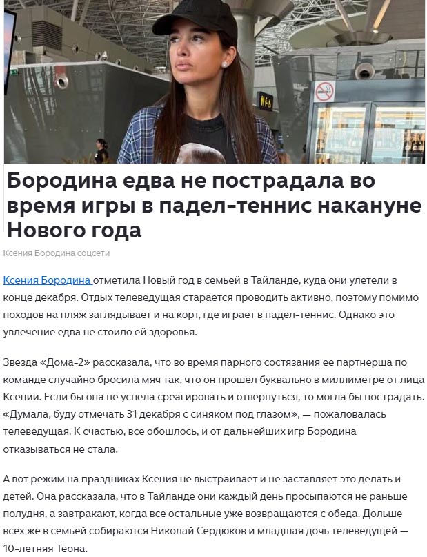 Правда в канун Нового года Ксения едва не получила серьезное увечье во время игры в падл-теннис. Неожиданно неопытная партнерша Бородиной неудачно кинула мяч в сторону бывшей ведущей легендарной телестройки. И последний пролетел буквально в миллиметре от лица звезды российского телевидения.