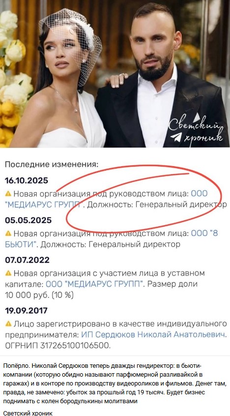 19 октября 2025 года обеспеченный женой Николай Сердюков открыл новый бизнес.