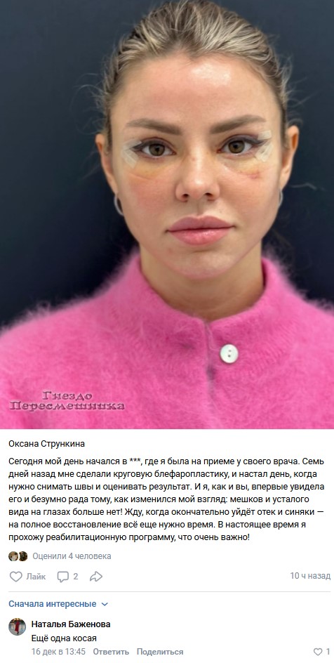 16 декабря 2025 года Оксана Стрункина показала себя после круговой подтяжки.