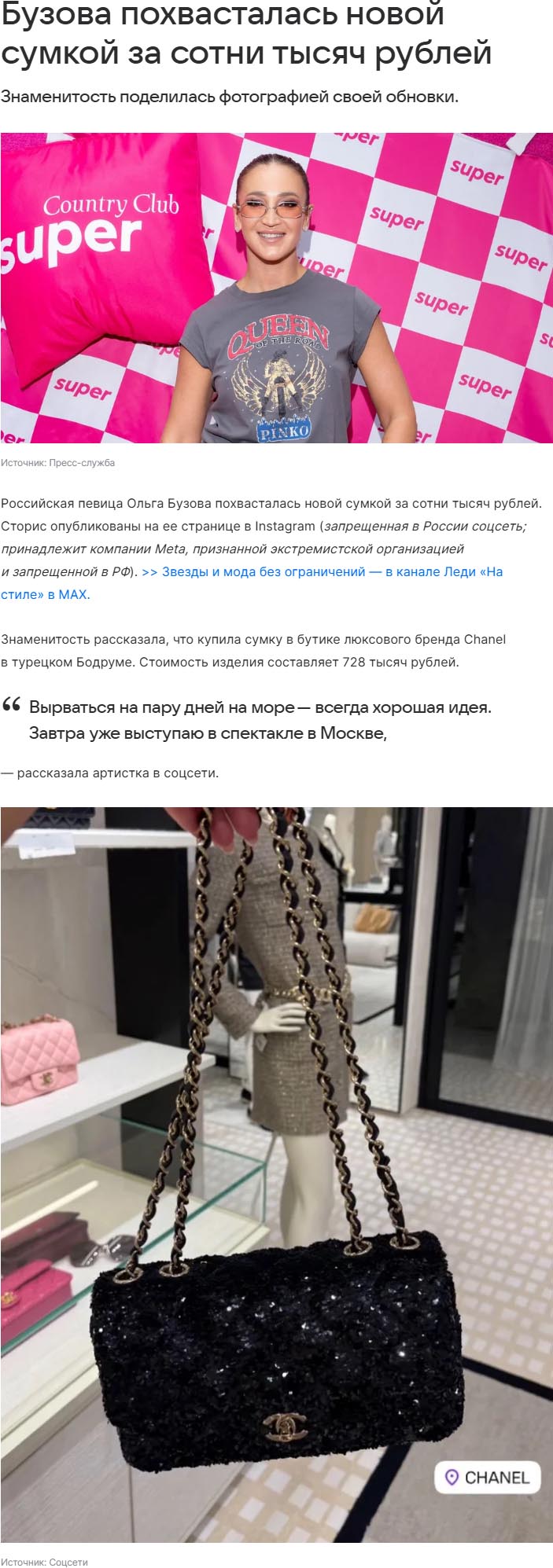 В одном из бутиков Бодрума Бузова приобрела сумку Chanel. Покупкой перед аудиторией звезда уже похвасталась в своем личном блоге. А фолловерам не составило труда узнать цену модного аксессуара, ведь все каталоги модных домов доступны в интернете с актуальными ценами.