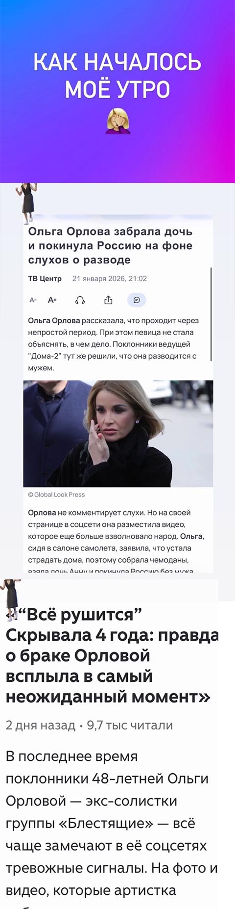 Накануне сама Орлова подтвердила слухи о разводе, но с неожиданной стороны. По её словам, она узнала о грядущем расставании с бизнесменом Валерием Масловым из статей жёлтой прессы. В некоторых СМИ даже написали, что телеведущая, не выдержав тягот жизни в России, вместе с дочерью срочно уехала за границу. Однако сама звезда очень быстро опровергла эти сообщения.
