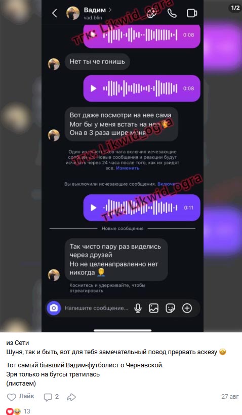 В сети появились скриншоты переписок парня, а также его голосовые, где он попросту уничтожил Черно. Молодой человек уверяет, что даже не посмотрел бы в сторону такой как Саша. А тем более не опустился бы до интимной близости с партнёршей, значительно превосходящей его по габаритам. Более того, если верить Вадиму, с Черно он пересекался только в общей компании. И даже там старался избегать общения, понимая, что совершенно не хочет оказаться с ней в одной постели.