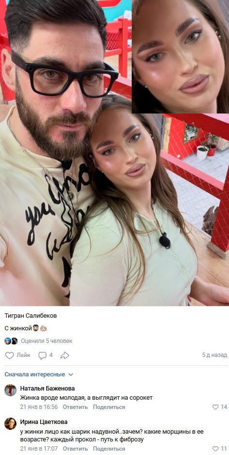 В социальных сетях разгорелся настоящий скандал после того, как бывший участник телепроекта «Дом-2» Тигран Салибеков обнародовал совместное фото с супругой Викторией Лысковец. Пользователи сети не смогли сдержать эмоций и обрушили на девушку поток резких комментариев. Многие из них уверены, что стремление к идеальной внешности привело к тому, что внешность Виктории серьёзно изменилась не в лучшую сторону.