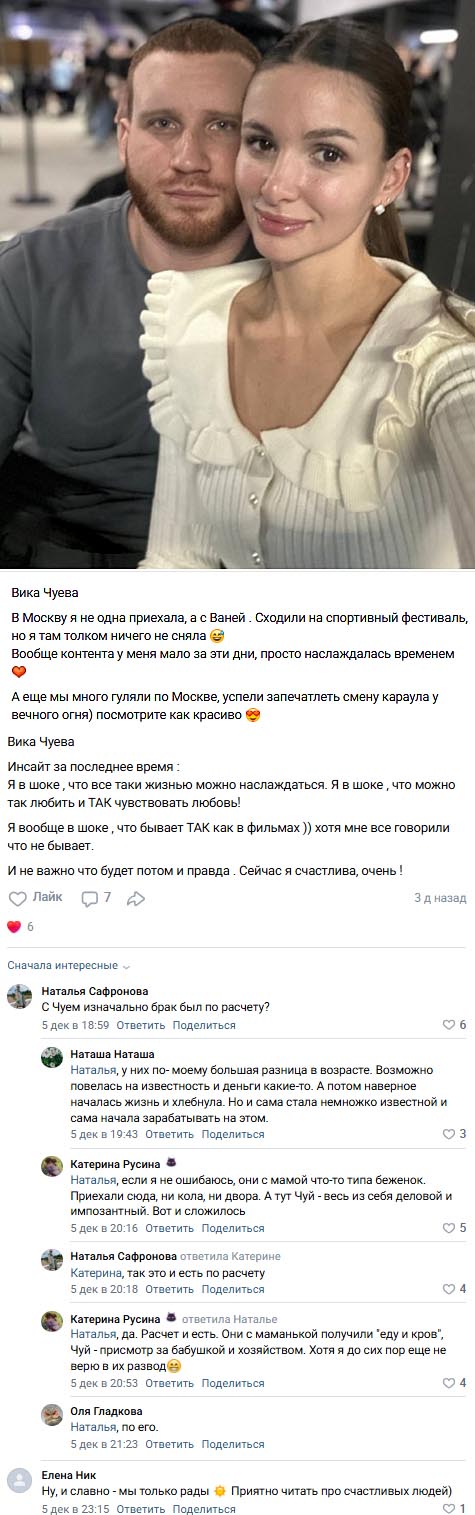 Судя по всему парочка быстро перешла от конфетно-букетного периода к серьезным отношениям, и теперь живет вместе с Иваном. При этом Чуева, которая изначально боялась сделать поспешный шаг к сожительству, рассказывает, насколько же она счастлива.