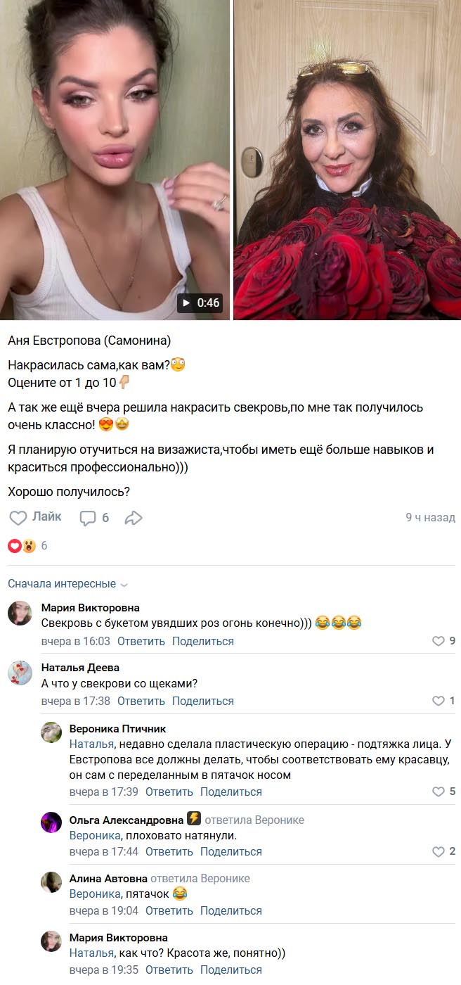 Однако подписчики Анны совершенно не разделяют подобного энтузиазма. Многие из них полагают, что к решению сделать пластическую операцию свекровь подтолкнул её сын — Максим Евстропов, супруг Анны. Известно, что Максим в прошлом сам прибегал к услугам пластической хирургии, сделав ринопластику. По мнению фолловеров, он может оказывать давление на окружающих, побуждая их изменять свою внешность. Стоит отметить, что за последние несколько лет Анна трижды прибегала к пластическим операциям. При этом результат ринопластики Максима многие считают неудачным, утверждая, что вместо ожидаемого эстетического эффекта он получил совершенно иной результат, который разочаровал его поклонников.