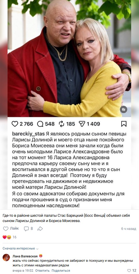 В центре внимания оказался Стас Барецкий, который выступил с весьма сенсационным заявлением. Мужчина утверждает, что имеет прямое отношение к известной певице Ларисе Долиной. По словам Барецкого, он является её внебрачным сыном и готов отстаивать свою позицию в судебном порядке.