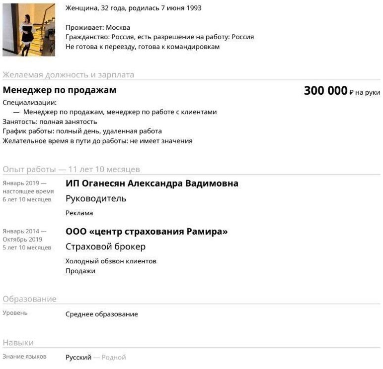 1 октября 2025 года резюме Александры Черно нашли на известном сайте по поиску работы.