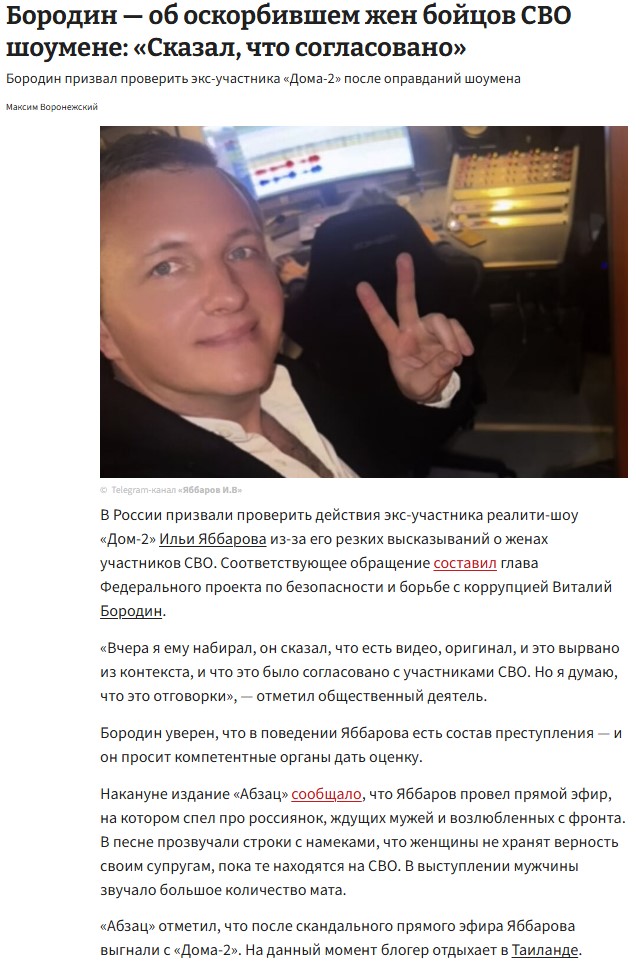 Глава Федерального проекта по безопасности и борьбе с коррупцией Виталий Бородин публично обратился к Ильей Яббарову и уверяет, что до этого успел пообщаться с ним лично. А все после того как видео, на котором Яббаров поет оскорбительные песенки про жен участников СВО облетели социальные сети. Мало кто сомневается, за такие саратовского шансонье мало выгнать с проекта, его надо посадить.