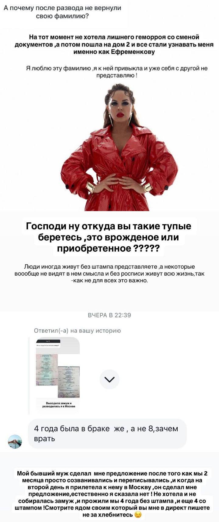 По словам Юлии, она изначально поставила условие, что совместная жизнь должна быть в столице. В Москве пара в итоге и заключила брак, а также расторгла его — это произошло незадолго до того, как Ефременкова пришла на «Дом-2». Юлия утверждает, что тогда не видела необходимости в официальном оформлении отношений, несмотря на совместное проживание с супругом.