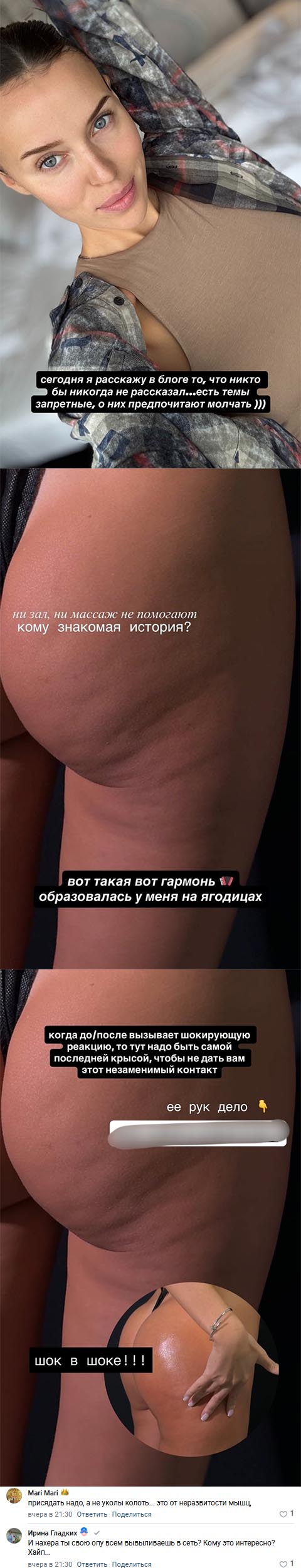 Бывшая участница телепроекта «Дом-2» Татьяна Строкова выразила недовольство внешним видом своей фигуры. В своих сторис она показала, какие складки образовались у неё на теле, несмотря на регулярные занятия в спортзале и массаж. Девушка отметила, что прилагала значительные усилия для поддержания формы, но результат её не удовлетворял.