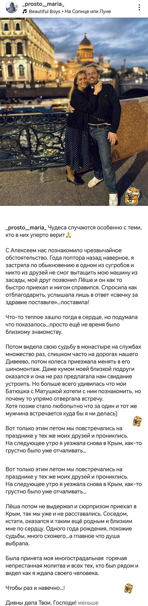 К слову на союз пока еще замужнюю Круглыхина благословил батюшка прихода, куда она ходит вместе с дочерьми. При этом сама Маша уверяет, что горячо молится о том, чтобы это был тот самый мужчина. Правда о совместном будущем, свадьбе и детях Круглыхина сама не задумывается. Напомним, от предыдущих отношений Маша растит сына и двух дочерей.
