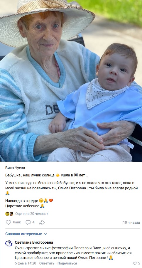 Печальную новость Вика сопроводила снимками пожилой женщины с правнуком. При этом девушка поспешила подчеркнуть, что за годы совместной жизни Ольга Петровна стала для нее родным и близким человеком. Более того, фактически заменила бабушку, которую сама Вика уже не помнит.