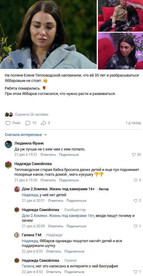 Яна Фиткевич в ходе разговора обратила внимание на возраст Елены, отметив, что той уже исполнилось 35 лет. По мнению ведущей, это существенно снижает шансы Тепловодской на поиск нового партнёра в рамках проекта. Фиткевич уверена, что Илья — наилучший вариант для Елены, и других претендентов на её внимание просто не будет. Таким образом, ведущая ясно дала понять, что, по её мнению, у Елены нет перспектив на «Доме-2» вне отношений с Яббаровым.