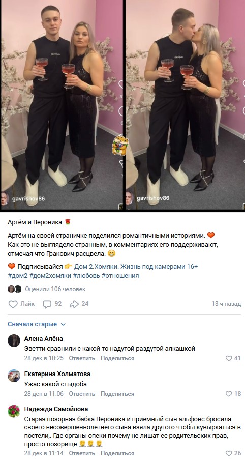 В последнее время Вероника Лысковец окончательно потеряла стыд. В сети обсуждают кадры, на которых домовская бабушка на камеру целует своего молодого любовника. К слову Артем Гавришов, с которым Вероника объявила пару и даже заселилась, годиться ей в сыновья.