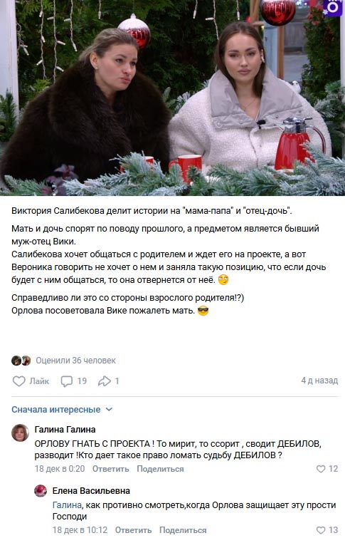 Центральной темой конфликта стало возможное появление в проекте отца Виктории. Судя по всему, мужчина действительно планирует посетить съёмочную площадку. Сама Виктория не видит в этом ничего плохого и открыта к общению с родителем. Однако её мать категорически против возобновления контактов с бывшим мужем, поскольку у неё накопилось множество претензий к нему.