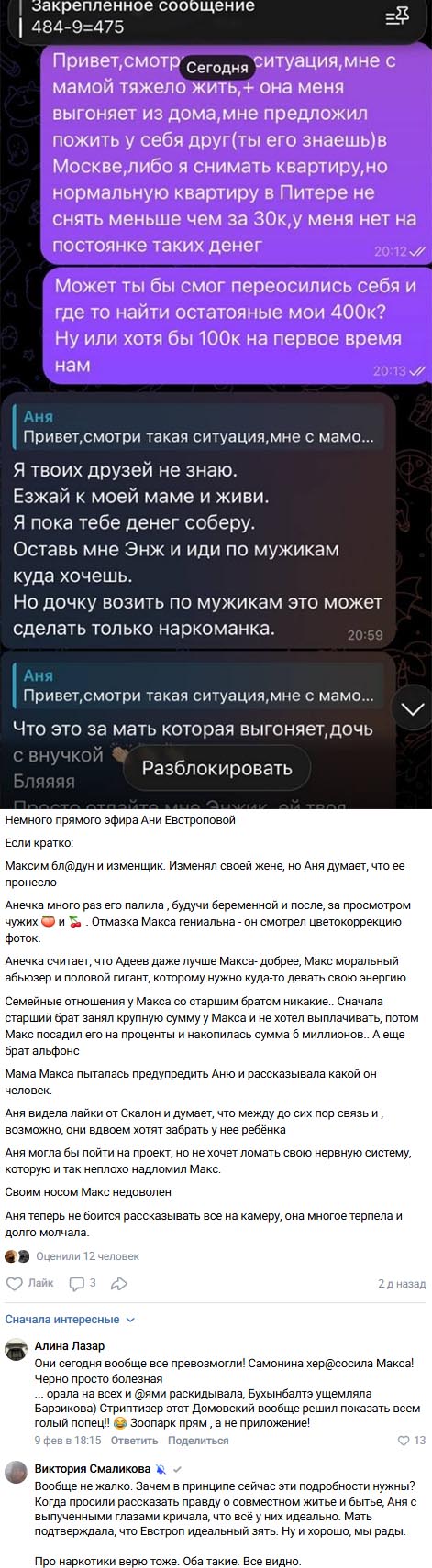 В отчаянии Самонина обратилась за финансовой помощью к своему почти бывшему мужу Максиму Евстропову. Однако вместо поддержки она услышала в свой адрес поток оскорблений и унижений. Евстропов не только не помог Анне, но и выдвинул ей шокирующее требование: отдать дочь, а уже потом заниматься устройством своей личной жизни. Такое поведение бывшего возлюбленного стало последней каплей для Самониной.
