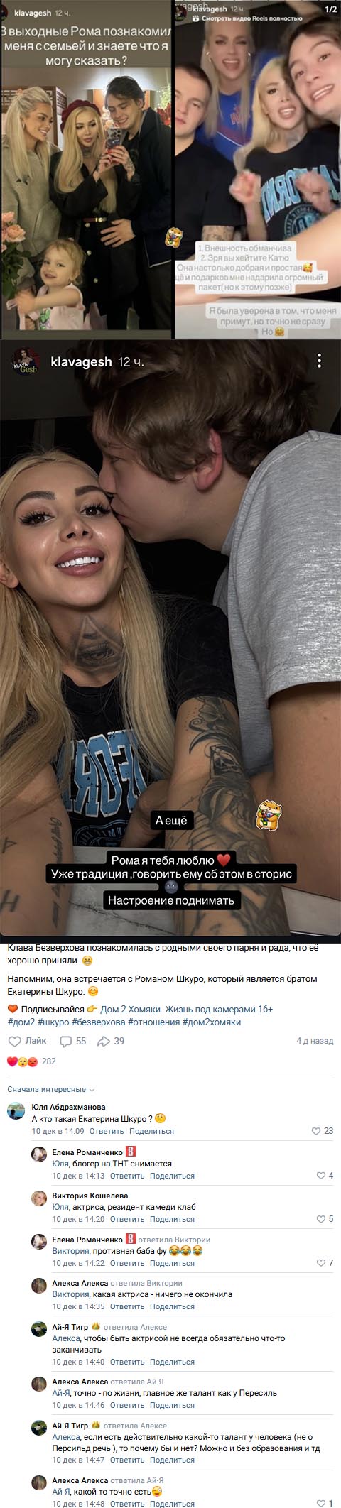 На днях брюнетка поделилась фото в компании родственников Романа и отметила, что он познакомил ее со своей большой семьей. Сама Клава призналась, как сильно боялась этого знакомства. Однако, как уже выяснилось, ее приняли достаточно хорошо и тепло. А родная сестра Романа, звезда ТНТ Екатерина Шкуро, даже надарила подарков.