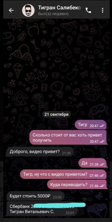 В сети всплыла переписка Салибекова с одним из подписчиков, где последний просит передать ему привет. И хотя мужчина сразу был готов заплатить, он вряд ли ожидал таких расценок. Так за короткий видео-привет Салибеков запросил 5 тысяч рублей и поспешил скинуть номер карты.