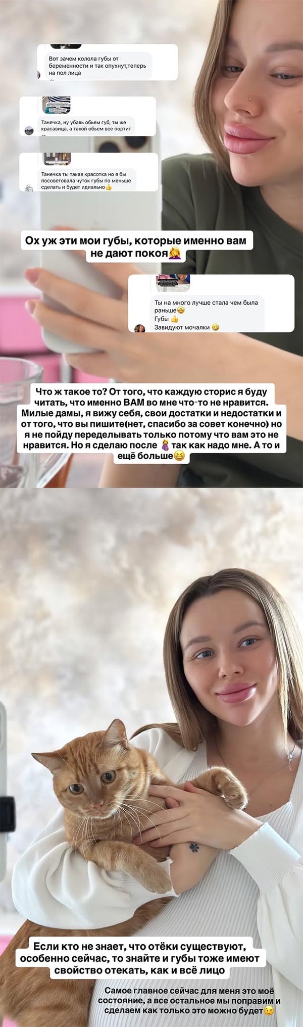Беременной выпускнице дома 2 приходится оправдываться за свой внешний вид. Фолловеры нисколько не оставляют надежд убедить Таню сдуть губы. А некоторые даже не церемонятся, оставляя под фото и видео Репиной нелестные комментарии.