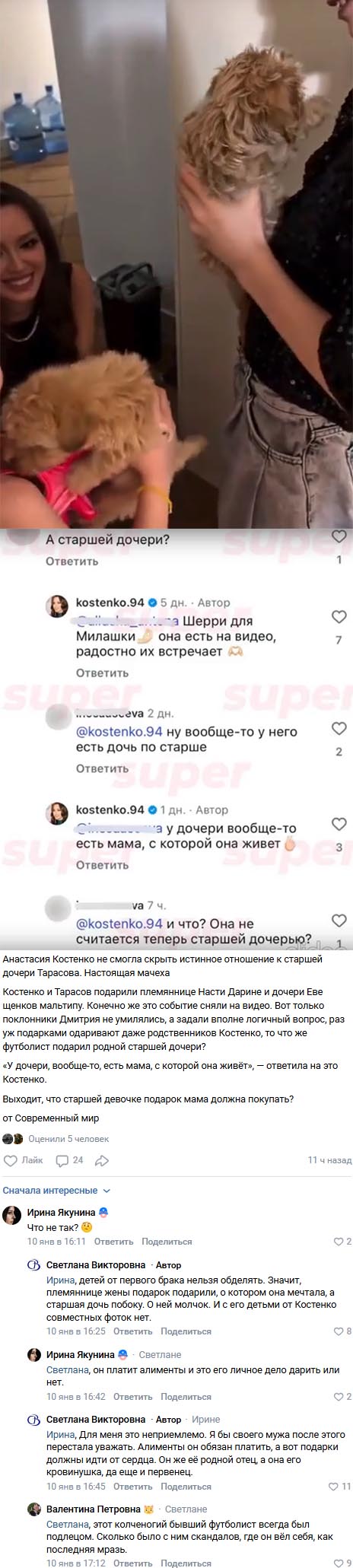 Поводом для обсуждения стало видео, которое Анастасия опубликовала в своём блоге. В ролике было видно, что на Новый год общая дочь Дмитрия Тарасова и Анастасии Костенко получила в подарок милого щенка породы мальтипу. Кроме того, подарок получил ещё и другой ребёнок — племянница пары. Это вызвало у подписчиков закономерный вопрос: почему Ангелина осталась без подарка, ведь она тоже ребёнок Дмитрия?