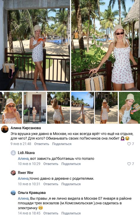 Недавно Марина Африкантова поспешила поделиться снимками с очередного отпуска. И подписчики сразу же вывели длинноволосую блондинку на чистую воду. Как оказалось, красочные фото с Шри Ланка не более чем попытка пусть фолловерам пыль в глаза.
