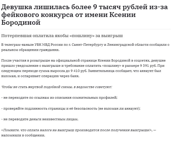 В правоохранительные органы обратилась молодая женщина, проживающая в Санкт-Петербурге. Она поведала свою историю, которая произошла с ней в интернете. Уроженка северной столицы стала участницей розыгрыша, который, как ей казалось, организовывала известная телеведущая Ксения Бородина — одна из ведущих популярного телепроекта «Дом-2».
