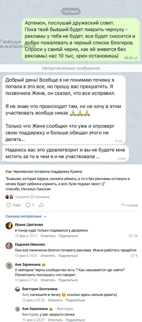 Саша Артемова опубликовала сообщение, которое ей прислали хейтеры Александры Черно. Последние обещают превратить её интернет проекты в ничто и лишить Артемову рекламных заработков. И все из-за поддержки Евгения Кузина, которую он оказывает Черно.